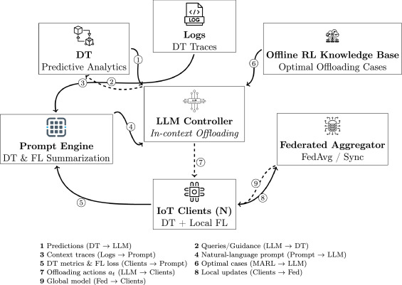 This study considers the combination of Digital Twins (DT), Federated Learning (FL), and computation offloading to establish a context-aware framework for effective resource management in IoT networks. Although DT models can predict battery levels, CPU usage, and network delays to aid reinforcement learning (RL) agents, earlier RL-based controllers require significant training and are slow to adapt to changes. To overcome this issue, we propose a Large Language Model (LLM)-assisted offloading method that transforms real-time DT predictions and selected historical Explainable DT with Federated Multi-Agent RL (MARL) examples into structured natural-language prompts. Through in-context learning, LLM deduces offloading tactics without retraining, while FL aligns global convergence metrics to optimize the balance between inference accuracy and energy efficiency. Simulation studies conducted for baseline and unstable wireless network scenarios reveal that the LLM controller persistently maintains near-optimal latency and reduces energy use. In a baseline scenario with devices, the LLM achieves an average latency of 252 ms, which is only 5 % higher than edge offloading, while cutting energy consumption by around 20 %. Under unstable wireless conditions, it achieves an average latency of 276 ms with energy use of 0.122 J, as opposed to 0.154 J for edge offloading. These findings validate that LLM-based decision making facilitates scalable, adaptive, and energy-efficient task scheduling, presenting a viable alternative to RL controllers in DT-enabled federated IoT systems.